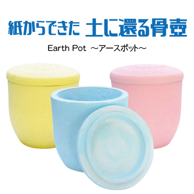 一つ一つ手づくりされた「アースポット」は、100%紙原料からできており、土に中で自然に還す目的の骨壺です。ご自宅の庭先や畑の土中に埋葬する事ができ、自然に分解されます。