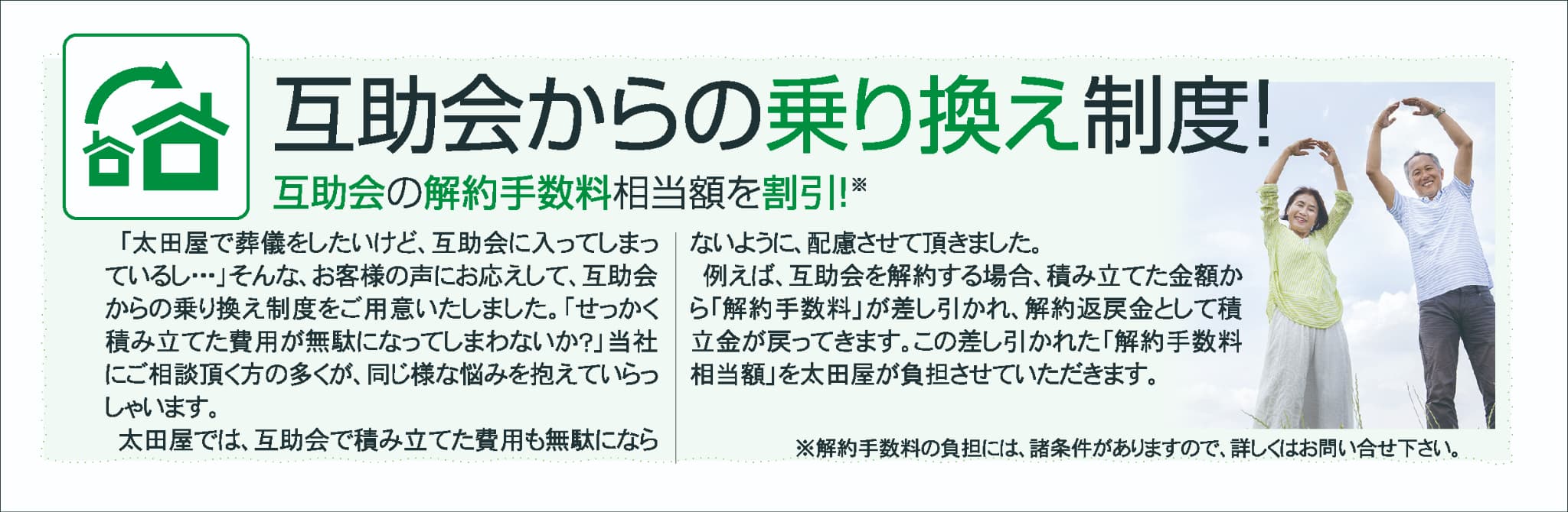 「太田屋で葬儀をしたいけど、互助会に入ってしまっているし・・・」そんな、お客様の声にお応えして、互助会からの乗り換え制度をご用意いたしました。「せっかく積み立てた費用が無駄になってしまわないか?」当社にご相談頂く方の多くが、同じ様な悩みを抱えていらっしゃいます。